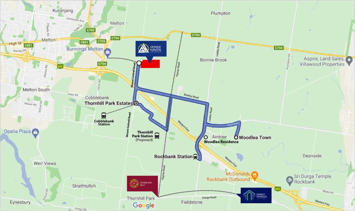 This area, in the Melton East PSP pre-commencement phase, is thriving with developer interest, and discussions are ongoing with the Victoria Planning Authority (VPA). We are near Rockbank, Tarneit, Caroline Springs, and Melton, with the Rockbank train station and proposed Thornhill Park station only a few minutes away. Planned infrastructure includes a ring road extension for quick access to the city or airport, and the nearby Westfield shopping center is under construction.
